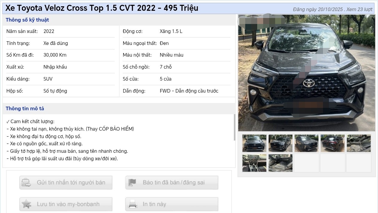 Một chiếc Toyota Veloz Cross Top 1.5 CVT đời 2022 đang được rao bán với giá 495 triệu đồng, đăng trên một trang rao vặt vào ngày 20/10/2025. Chiếc xe đã đi khoảng 30.000Km, thuộc phiên bản nhập khẩu, kiểu dáng SUV 7 chỗ, màu đen, dẫn động cầu trước và sử dụng hộp số tự động CVT kết hợp động cơ xăng 1.5L. Theo thông tin từ người rao, đây là mẫu xe có giấy tờ hợp lệ và được hỗ trợ sang tên nhanh chóng.